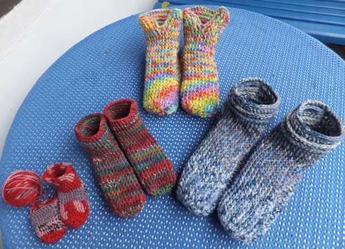 Sie mag den Häkelhaken eigentlich nicht so gern, aber dieses Häkeln hat auch ihr so gut gefallen, dass sie nach dem 1. Paar (die Rotbunten im Foto) gleich noch ein Paar Baby-Gammlos häkelte.