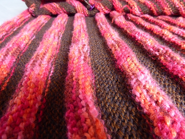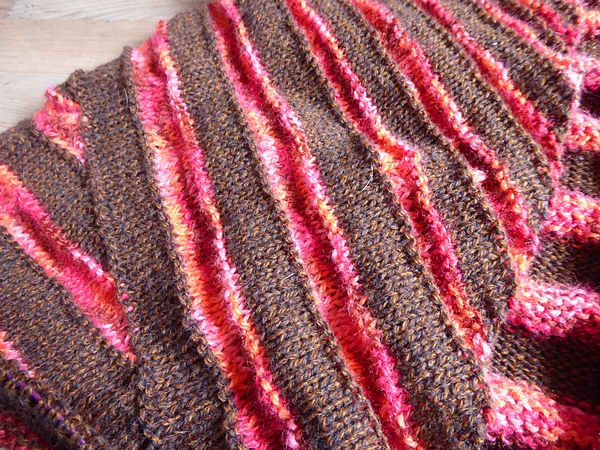 Scheint diesmal aber auch an der Wolle zu liegen, denn die orangeroten Streifen wölben sich nach innen, die braunen Streifen sind glatt, obwohl beide gleich gestrickt sind.